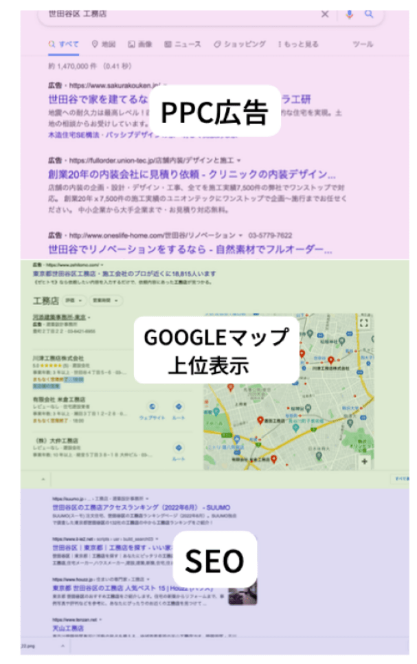 図はGoogle検索で「世田谷工務店」と検索したときの結果です。このように「地域」+「キーワード」で検索をすると地図が表示されるようになります。紫色の部分はGoogle広告(PPC広告)の表示枠で1~3件が表示されます。